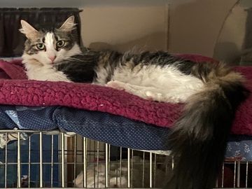 Fluffy is a young girl who can take a while to settle in. She is happy to hang wherever you are, but not a huge fan of being picked up. She gets along great with other kitties and really would thrive with some time and patience.