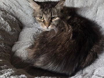 Fluffy is a young girl who can take a while to settle in. She is happy to hang wherever you are, but not a huge fan of being picked up. She gets along great with other kitties and really would thrive with some time and patience.