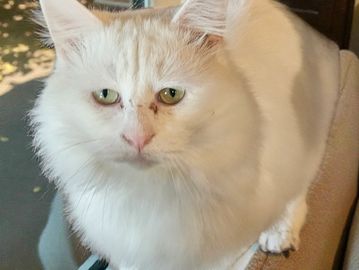 Hotel came from a local rescue after she was rescued from a hoarding situation. Hotel suffers from upper respiratory disease and seizures. She is maintained on medication and herbal supplements. She is shy and not a fan of people so she is considered a hospice kitty. She visits the vet every few months to make sure her medications are correct and to have bloodwork done to monitor her kidneys and liver.